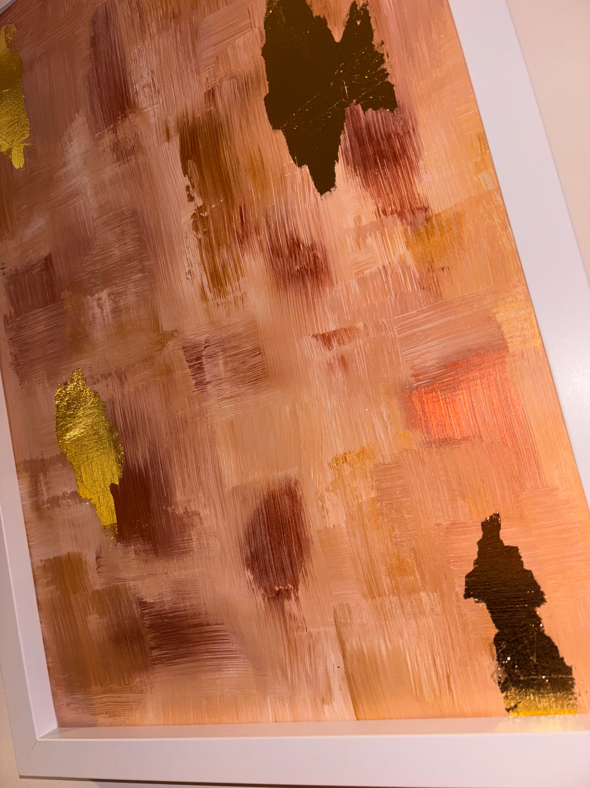 This abstract painting is built through layers of warm, earthy tones and textured brushstrokes. Soft copper and blush shades create a glowing background, while the gold leaf add contrast, depth, and subtle shimmer. The piece is about balance — between light and shadow, softness and boldness — inviting the viewer to slow down and interpret it in their own way. Acrylic and gold leaf on linen blend A3 paper. Frame not included.